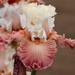 unikátní kosatec, d. směs manga a broskve, f. bílé s okrajem jako d., tmavě mangové hafty a kolem kartáčků, silně nařasený |