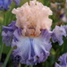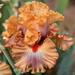 unikátní kosatec, d. směs manga a broskve, f. bílé s okrajem jako d., tmavě mangové hafty a kolem kartáčků, silně nařasený |
